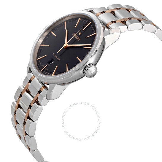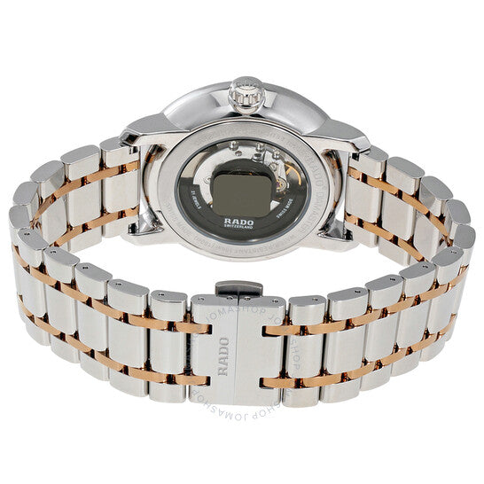 Stainless steel case with a two-tone (silver-tone and rose gold PVD ) stainless steel bracelet. Fixed stainless steel bezel. Black dial with rose gold-tone hands and index hour markers. Minute markers around the outer rim. Dial Type: Analog. Date display above the 6 o'clock position. Rado calibre 629 (ETA 2892-A2) automatic movement, based upon ETA 2892-A2, containing 21 Jewels, bitting at 28800 vph, and has a power reserve of approximately 42 hours. Scratch resistant sapphire crystal. Pull / push crown. Transparent case back. Round case shape. Case size: 41 mm. Case thickness: 9.9 mm. Band width: 20 mm. Fold over clasp with a push button release. Water resistant at 100 meters / 330 feet. Functions: date, hour, minute, second. Diamaster Series. Luxury watch style. Watch label: Swiss Made. Rado DiaMaster XL Automatic Black Dial Men's Watch R14077163.