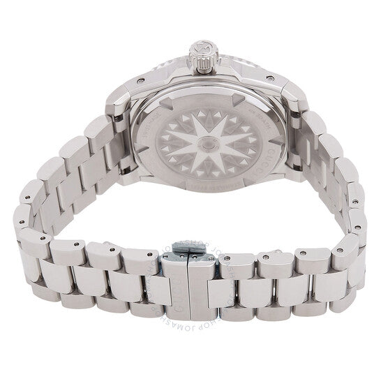 Silver-tone stainless steel case and bracelet. Uni-directional rotating black ceramic bezel. Blue dial with luminous hands and batons hour markers. Minute markers around the outer rim. Dial Type: Analog. Luminescent hands and markers. Automatic movement. Scratch resistant sapphire crystal. Screw down crown. Solid case back. Round case shape, case size: 40 mm. Fold over clasp with a safety release. Water resistant at 300 meters / 1000 feet. Functions: hour, minute, second. Dive Series. Dive watch style. Watch label: Swiss Made. Gucci Dive Automatic Blue Dial Men's Watch YA136362.