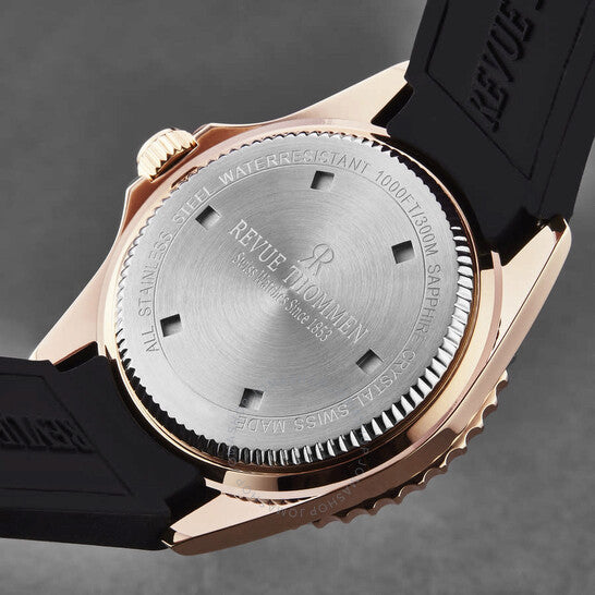 Rose gold-tone stainless steel case with a black rubber strap. Uni-directional rotating rose gold-tone bezel with an inlaid blue metallic ring. Blue dial with luminous rose gold-tone hands and dot hour markers. Minute markers around the outer rim. Dial Type: Analog. Luminescent hands and markers. Date display at the 3 o'clock position. Caliber SW200 automatic movement with a 38hour power reserve. Scratch resistant sapphire crystal. Screw down crown. Solid case back. Round case shape. Case size: 42 mm. Case thickness: 13 mm. Band width: 22 mm. Band length: 8 inches. Fold over clasp with a push button release. Water resistant at 30 meters / 100 feet. Functions: date, hour, minute, second. Diver Series. Luxury watch style. Watch label: Swiss Made. Revue Thommen Diver Automatic Blue Dial Men's Watch 17571.2865.