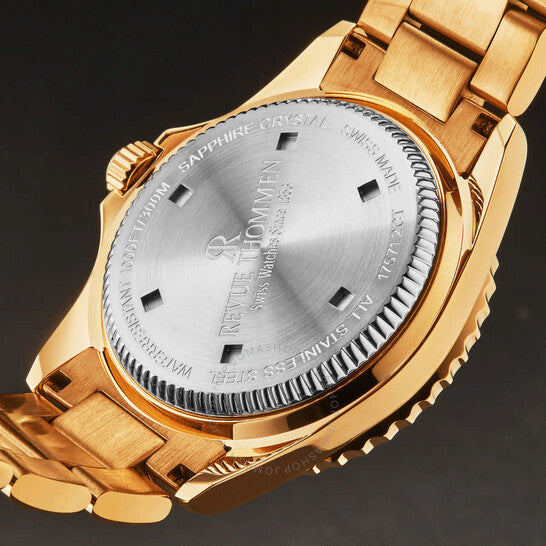 Rose gold-tone stainless steel case and bracelet. Uni-directional rotating green stainless steel bezel. Green dial with rose gold-tone hands and index hour markers. Minute markers around the outer rim. Dial Type: Analog. Luminescent hands and markers. Date display at the 3 o'clock position. Sellita Caliber SW200 Automatic movement, containing 26 Jewels, bitting at 28800 vph, and has a power reserve of approximately 38 hours. Scratch resistant sapphire crystal. Screw down crown. Solid case back. Round case shape, case size: 42 mm, case thickness: 12.65 mm. Band width: 22 mm, band length: 8 inches. Fold over clasp with a safety release. Water resistant at 300 meters / 1000 feet. Functions: date, hour, minute, second. Additional Info: hours, minutes, seconds, date. Diver Series. Dive watch style. Watch label: Swiss Made. Revue Thommen Diver Automatic Green Dial Men's Watch 17571.2464.