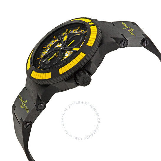 Black rubber covered stainless steel case with a black rubber strap with black ceramic elements. Uni-directional rotating black rubber covered stainless steel bezel with yellow ceramic baguette inserts. Black skeleton dial with luminous grey hands and index hour markers. Minute markers around the outer rim. Dial Type: Analog. Luminescent hands and markers. Date display at the 6 o'clock position. Two sub-dials displaying: 60 second and power reserve. Ulysse Nardin calibre UN-26 hand wind movement with a 42-hour power reserve. Scratch resistant sapphire crystal. Screw down crown. Transparent case back. Round case shape. Case size: 45.8 mm. Band width: 22 mm. Push button clasp. Water resistant at 200 meters / 660 feet. Functions: date, hour, minute, second, power reserve indicator, chronometer. Luxury watch style. Watch label: Swiss Made. Ulysse Nardin Diver Black Sea Automatic Black Dial Men's Watch 263-92B4-3C/924.