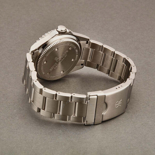Stainless steel case with a stainless steel bracelet. Uni-directional rotating stainless steel bezel with an inlaid blue ring. Black dial with luminous silver-tone hands and dot hour markers. Minute markers around the outer rim. Dial Type: Analog. Luminescent hands and markers. Date display at the 3 o'clock position. Automatic movement. Scratch resistant sapphire crystal. Screw down crown. Solid case back. Round case shape. Case size: 42 mm. Case thickness: 14 mm. Band width: 21.8 mm. Band length: 8 inches. Deployment with push button release clasp. Water resistant at 300 meters / 1000 feet. Functions: date, hour, minute, second. Diver Xl Series. Sport watch style. Watch label: Swiss Made. Revue Thommen Diver XL Automatic Black Dial Men's Watch 17571.2135.