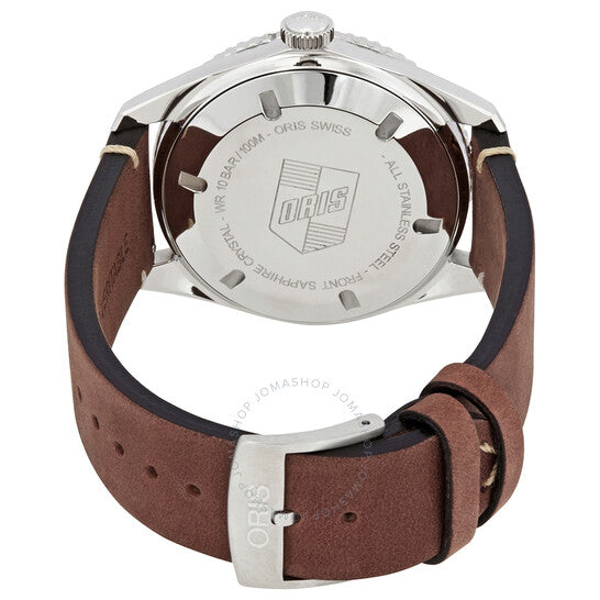 Stainless steel case with a brown leather strap. Uni-directional rotating coin edge stainless steel bezel with a black DLC ring. Black dial with luminous silver-tone hands and dot hour markers. Minute markers around the outer rim. Dial Type: Analog. Luminescent hands and markers. Date display at the 3 o'clock position. Oris calibre 733 automatic movement, based upon Sellita SW200-1, containing 26 Jewels, bitting at 28800 vph, and has a power reserve of approximately 38 hours. Scratch resistant sapphire crystal. Screw down crown. Solid case back. Round case shape. Case size: 42 mm. Case thickness: 10 mm. Band width: 21 mm. Tang clasp. Water resistant at 100 meters / 330 feet. Functions: date, hour, minute, second. Divers Sixty-five Series. Casual watch style. Watch label: Swiss Made. Oris Divers Sixty-Five Automatic Black Dial Men's Watch 01 733 7720 4054-07 5 21 45.