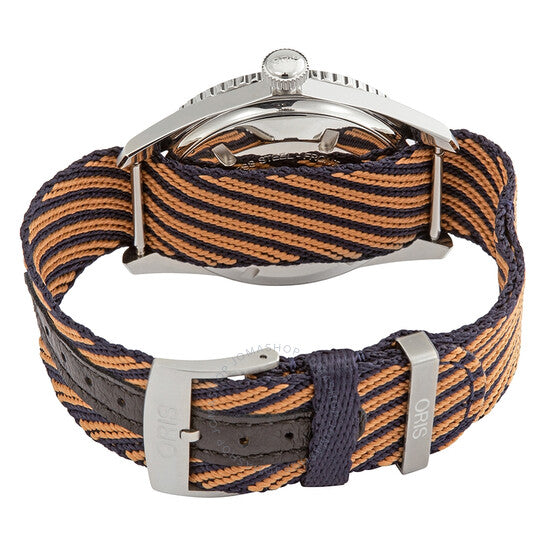 Stainless steel case with a orange and blue fabric strap. Uni-directional rotating coin edge stainless steel bezel with a black DLC ring. Blue dial with luminous rose gold-tone hands and dot hour markers. Minute markers around the outer rim. Dial Type: Analog. Luminescent hands and markers. Date display at the 3 o'clock position. Oris calibre 733 automatic movement, based upon Sellita SW200-1, containing 26 Jewels, bitting at 28800 vph, and has a power reserve of approximately 38 hours. Scratch resistant sapphire crystal. Screw down crown. Solid case back. Round case shape. Case size: 42 mm. Case thickness: 10 mm. Band width: 21 mm. Tang clasp. Water resistant at 100 meters / 330 feet. Functions: date, hour, minute, second. Divers Sixty-five Series. Casual watch style. Watch label: Swiss Made. Oris Divers Sixty-Five Automatic Blue Dial Men's Watch 01 733 7720 4035-07 5 21 13.