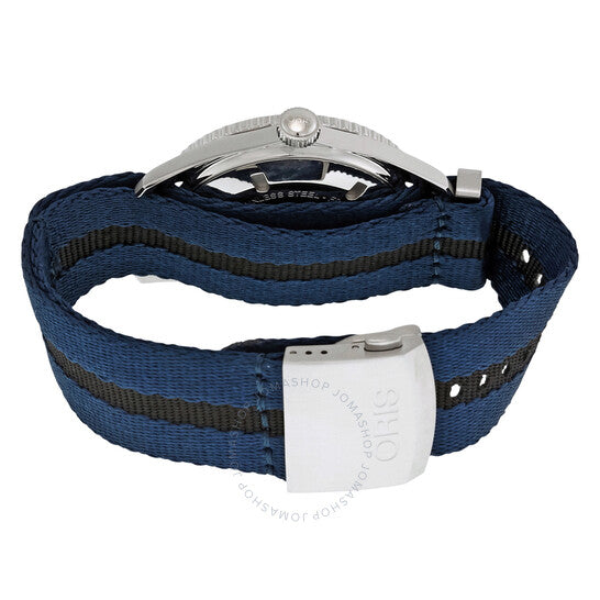 Silver-tone stainless steel case with a blue (black stripe) fabric strap. Uni-directional rotating coin edge stainless steel bezel with a black DLC top ring. Blue dial with luminous silver-tone hands and dot hour markers. Minute markers around the outer rim. Dial Type: Analog. Luminescent hands and markers. Date display at the 3 o'clock position. Oris calibre 733 automatic movement, based upon Sellita SW200-1, containing 26 Jewels, bitting at 28800 vph, and has a power reserve of approximately 38 hours. Scratch resistant sapphire crystal. Screw down crown. Solid case back. Round case shape. Case size: 42 mm. Band width: 21 mm. Deployment clasp with a push button release. Water resistant at 100 meters / 330 feet. Functions: date, hour, minute, second. Divers Sixty-five Series. Luxury watch style. Watch label: Swiss Made. Oris Divers Sixty-Five Automatic Men's Watch 01 733 7720 4055-07 5 21 28FC.