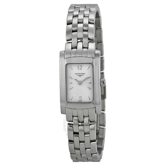 Stainless steel case with a stainless steel bracelet. Fixed stainless steel bezel. White dial with silver-tone hands and index hour markers. Arabic numerals mark the 6 and 12 o'clock positions. Dial Type: Analog. Quartz movement. Scratch resistant Sapphire crystal. Pull / push crown. Solid case back. Case dimensionsr: 16 mm x 20 mm. Case thickness: 6.5 mm. Rectangle case shape. Bracelet width: 12 mm. Deployment clasp with a push button release. Water resistant at 50 meters / 165 feet. Functions: hour, minute. Casual watch style. Longines Dolce Vita Ladies Watch L5.158.4.16.6.