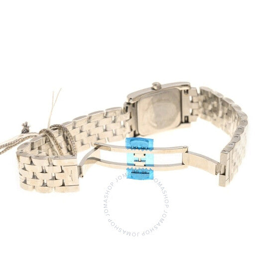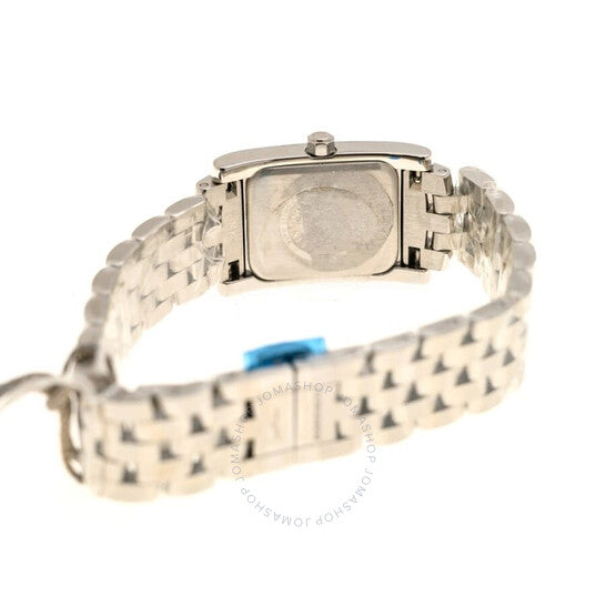 Silver-tone stainless steel case and bracelet. Fixed silver-tone bezel with diamond set stainless steel. Black dial with silver-tone hands and Arabic numeral hour markers. Dial Type: Analog. Quartz movement. Scratch resistant sapphire crystal. Solid case back. Rectangle case shape, case size: 19 mm. Fold over clasp with a safety release. Water resistant at 30 meters / 100 feet. Functions: hour, minute. Dolce Vita Series. Luxury watch style. Watch label: Swiss Made. Longines Dolce Vita Quartz Diamond Black Dial Ladies Watch L5.155.0.58.6.