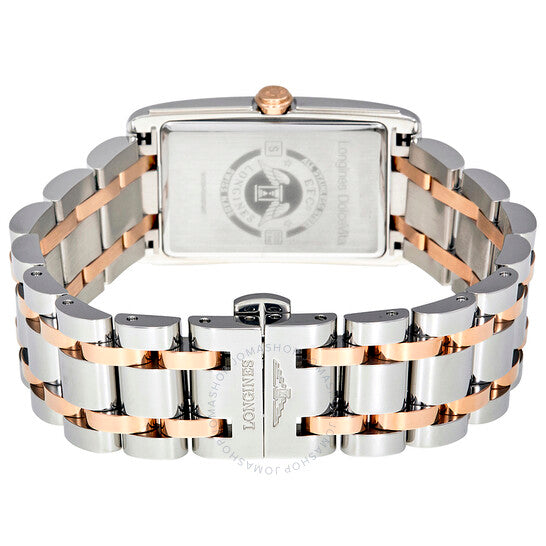 Stainless steel case with a stainless steel bracelet with 18kt rose gold links. Fixed silver-tone bezel. Black dial with rose gold-tone hands and diamond hour markers. Dial Type: Analog. Small seconds subdials. Quartz movement. Scratch resistant sapphire crystal. Pull / push crown. Solid case back. Case dimensions: 23 mm x 37 mm. Rectangle case shape. Deployment clasp. Water resistant at 30 meters / 100 feet. Functions: hour, minute, small second. Luxury watch style. Watch label: Swiss Made. Longines DolceVita Black Dial Diamond Ladies Watch L5.512.5.57.7.