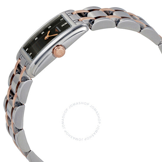 Stainless steel case with a stainless steel and 18kt rose gold bracelet. Fixed stainless steel bezel. Black dial with rose gold-tone hands and diamond hour markers. Dial Type: Analog. Quartz movement. Scratch resistant sapphire crystal. Pull / push crown. Solid case back. Case size: 17 mm. Case thickness: 7.5 mm. Round case shape. Deployment clasp. Water resistant at 30 meters / 100 feet. Functions: hour, minute. Luxury watch style. Watch label: Swiss Made. Longines DolceVita Black Dial Diamond Ladies Watch L52585577.