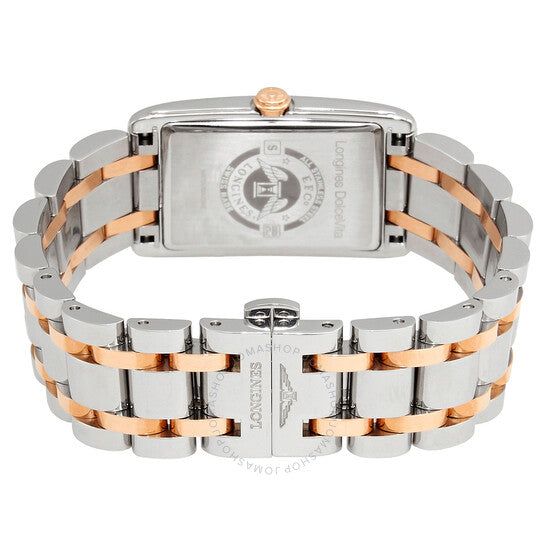 Silver-tone stainless steel case with a silver-tone stainless steel with 18kt rose gold links bracelet. Fixed silver-tone stainless steel bezel. Silver dial with blue hands and Roman numeral hour markers. Dial Type: Analog. One subdial displaying: small seconds. Longines Calibre L176 quartz movement. Scratch resistant sapphire crystal. Pull / push crown. Solid case back. Rectangle case shape, case size: 23.3 mm x 37 mm, case thickness: 7.2 mm. Band width: 17 mm. Fold over clasp with a push button release. Water resistant at 30 meters / 100 feet. Functions: hour, minute, small second. Dolcevita Series. Dress watch style. Watch label: Swiss Made. Longines DolceVita Quartz Silver Dial Ladies Watch L5.512.5.71.7.