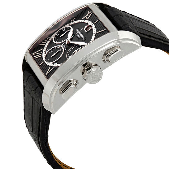 Stainless steel case with a leather strap. Fixed bezel. Black dial with silver-tone hands and Roman numeral hour markers. Dial Type: Analog. Date display at the 12 o'clock position. Chronograph - three sub-dials displaying: 60 second, 30 minute and 12 hour. Automatic movement. Sapphire scratch resistant crystal. Rectangle case shape. Case size: 50 mm x 37.6 mm. Deployment clasp. Water resistant at 30 meters / 100 feet. Functions: chronograph, date, hour, minute, second. Luxury watch style. Watch label: Swiss Made. Item Variations: 4878 STC 00200, 4878.STC.00200, 4878STC00200. Raymond Weil Don Giovanni Cosi Grande Black Dial Men's Watch 4878-STC-00200.
