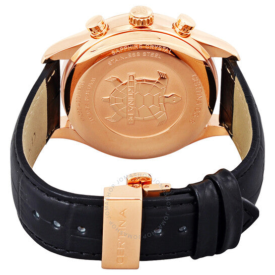 Rose gold PVD stainless steel case with a black leather strap. Fixed rose gold PVD bezel. Black dial with luminous rose gold-tone hands and index hour markers. Minute markers around the outer rim. Dial Type: Analog. Luminescent hands and markers. Date display at the 4 o'clock position. Three sub-dials displaying: 60 second, 60 minute and moonphase/average length of lunar cycle indicator. ETA caliber G10.962 BH PRD Precidrive quartz movement. Scratch resistant sapphire crystal. Pull / push crown. Solid case back. Round case shape. Case size: 42 mm. Case thickness: 11.8 mm. Band width: 20 mm. Butterfly clasp. Water resistant at 100 meters / 330 feet. Functions: chronograph, moonphase, date, hour, minute, second. Additional Info: suitable for snorkeling as well as swimming but not diving. DS-8 Chrono Moon Phase Series. Casual watch style. Watch label: Swiss Made. Certina DS-8 Chronograph Black Dial Men's Watch C033.450.36.051.00.