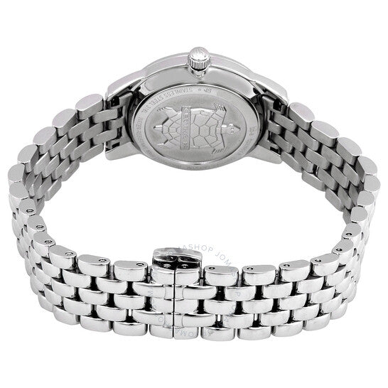 Stainless steel case with a stainless steel bracelet. Fixed stainless steel bezel. White mother of pearl dial with rose gold-tone hands and dot hour markers. A Roman numeral appears at the 12 o'clock position. Dial Type: Analog. Date display above the 6 o'clock position. Precidrive COSC Swiss chronometer quartz movement. Scratch resistant sapphire crystal. Screw down crown. Solid case back. Round case shape. Case size: 27.50 mm. Case thickness: 7 mm. Band width: 15 mm. Butterfly clasp. Water resistant at 100 meters / 330 feet. Functions: date, hour, minute, second, chronometer. Casual watch style. Watch label: Swiss Made. Certina DS-8 White Mother of Pearl Dial Ladies Watch C033.051.11.118.01.