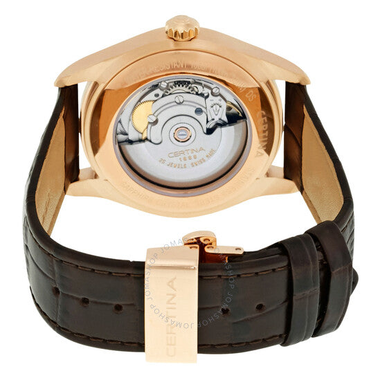 Rose gold-tone stainless steel case with a brown leather strap. Fixed rose gold-tone stainless steel bezel. Black dial with rose gold-tone hands and index hour markers. Minute markers around the outer rim. Dial Type: Analog. Date display between the 4 and 5 o'clock positions. ETA Caliber 2824-2 Automatic movement, based upon ETA 2824, containing 25 Jewels, bitting at 28800 vph, and has a power reserve of approximately 38 hours. Scratch resistant sapphire crystal. Transparent case back. Round case shape, case size: 39 mm, case thickness: 12 mm. Band width: 20 mm. Tang clasp. Water resistant at 100 meters / 330 feet. Functions: date, hour, minute, second. Ds-1 Series. Casual watch style. Watch label: Swiss Made. Certina DS 1 Automatic Black Dial Men's Watch C0064073608100.