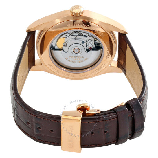 Rose gold-tone stainless steel case with a brown leather strap. Fixed rose gold-tone bezel. Silver dial with rose gold-tone hands and index hour markers. Minute markers around the outer rim. Dial Type: Analog. Date display between the 4 and 5 o'clock positions. ETA Caliber 2824-2 Automatic movement, based upon ETA 2824, containing 25 Jewels, bitting at 28800 vph, and has a power reserve of approximately 38 hours. Scratch resistant sapphire crystal. Transparent case back. Round case shape, case size: 39 mm, case thickness: 15 mm. Band width: 22 mm. Fold over clasp. Water resistant at 100 meters / 330 feet. Functions: date, hour, minute, second. Additional Info: suitable for snorkeling as well as swimming but not diving. Ds-1 Series. Casual watch style. Watch label: Swiss Made. Certina DS 1 Automatic Silver Dial Men's Watch C0064073603100.