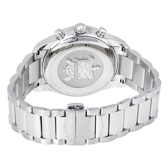Stainless steel case with a stainless steel bracelet. Fixed stainless steel bezel with a black top ring showing tachymeter markings. Black dial with luminous hands and index hour markers. Minute markers. 1/100th second markers around the outer rim. Dial Type: Analog. Luminescent hands and markers. Date display at the 6 o'clock position. Chronograph - three sub-dials displaying: 30 minute, 60 secondsand 12 hours. ETA caliber 251.264 quartz movement. Scratch resistant sapphire crystal. Screw down crown. Solid case back. Case size: 41 mm. Case thickness: 12.54 mm. Round case shape. Bracelet width: 20 mm. Deployment clasp with a push button release. Water resistant at 100 meters / 330 feet. Functions: chronograph, tachymeter, date, hour, minute, second, tachymeter. Sport watch style. Watch label: Swiss Made. Certina DS 2 Chronograph Black Dial Men's Watch C024.447.11.051.02.