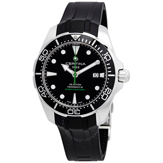 Stainless steel case with a black rubber strap. Uni-directional rotating stainless steel bezel with a black aluminium (count-up elapsed time) top ring. Black dial with luminous silver-tone arrow-shaped hands and dot hour markers. Minute markers around the outer rim. Dial Type: Analog. Luminescent hands and markers. Date display at the 3 o'clock position. Powermatic 80.111 automatic movement, containing 23 Jewels, bitting at 28800 vph, and has a power reserve of approximately 80 hours. Scratch resistant sapphire crystal. Screw down crown. Solid case back. Round case shape. Case size: 43 mm. Case thickness: 13.1 mm. Band width: 20 mm. Deployment with push button release clasp. Water resistant at 300 meters / 1000 feet. Functions: date, hour, minute, second. DS Action Diver Series. Dive watch style. Watch label: Swiss Made. Certina DS Action Diver Automatic Black Dial Men's Watch C032.407.17.051.00.
