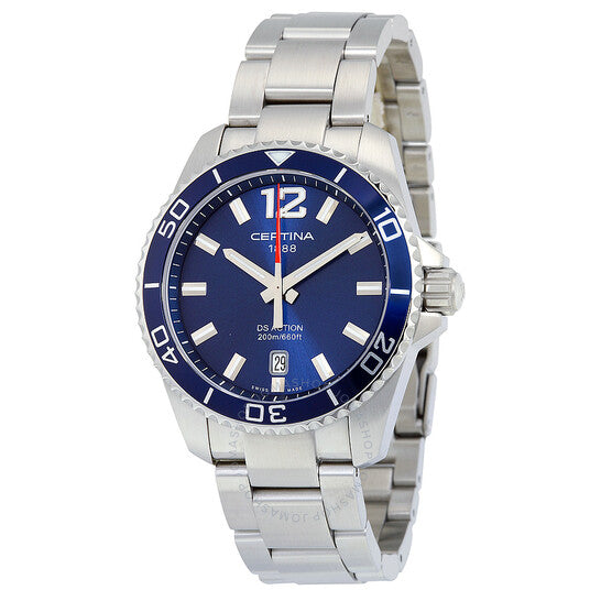 Stainless steel case with a stainless steel bracelet. Rotating stainless steel bezel with a blue top ring. Blue dial with luminous hands and index hour markers. An Arabic numeral appears at the 12 o'clock position. Minute markers around the outer rim. Dial Type: Analog. Luminescent hands and markers. Date display at the 6 o'clock position. Quartz movement. Scratch resistant sapphire crystal. Screw down crown. Solid case back. Case diameter: 40.50 mm. Case thickness: 11 mm. Round case shape. Band width: 21 mm. Deployment clasp with push button release. Water resistant at 200 meters / 660 feet. Functions: date, hour, minute, second. Sport watch style. Watch label: Swiss Made. Certina DS Action Stainless Steel Men's Quartz Watch C0134101104700.