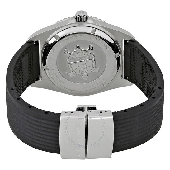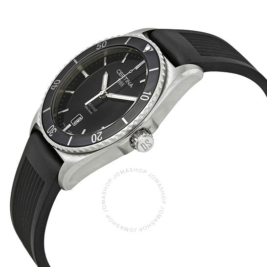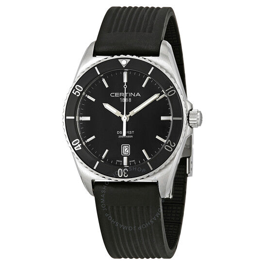 Stainless steel case with a black rubber strap. Rotating black ceramic bezel. Black dial with luminous hands and sticks hour markers. Dial Type: Analog. Date display at the 6 o'clock position. Quartz movement. Scratch resistant sapphire crystal. Screw down crown. Solid case back. Case size: 41 mm. Round case shape. Tang clasp. Water resistant at 200 meters / 660 feet. Functions: date, hour, minute, second. Sport watch style. Watch label: Swiss Made. Item Variations: C0144101705100. Certina DS First Ceramic Black Rubber Men's Quartz Watch C014.410.17.051.00.
