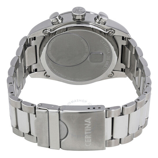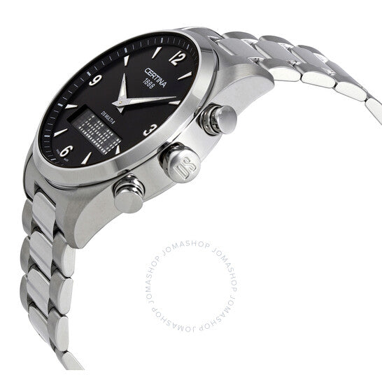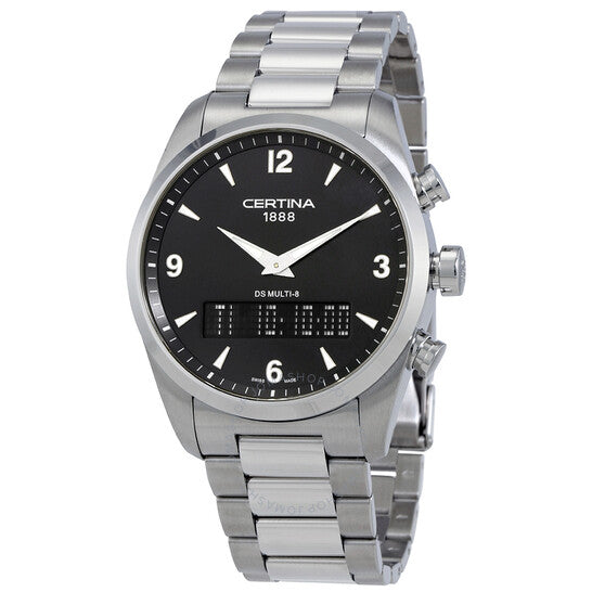 Stainless steel case with a stainless steel bracelet. Fixed bezel. Black dial with silver-tone hands and index and Arabic numeral hour markers. Minute markers around the outer rim. Dial Type: Analog-digital. Luminescent hands and markers. Perpetual calendar. ETA Caliber E49.351 quartz movement. Scratch resistant sapphire crystal. Solid case back. Case size: 42 mm. Round case shape. Deployment with push button release clasp. Water resistant at 100 meters / 330 feet. Functions: perpetual calendar, chronograph, alarm, year, month, date, day, GMT, second time zone, hour, minute, second, power reserve indicator. Dress watch style. Watch label: Swiss Made. Certina DS Multi-8 Stainless Steel Men's Quartz Watch C020.419.11.057.00.