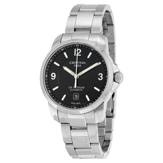 Silver-tone stainless steel case and bracelet. Fixed smooth silver-tone stainless steel bezel. Black dial with luminous hands and index hour markers. Arabic numerals mark the 3, 9 and 12 o'clock positions. Arabic numeral minute markers (at 5 minute intervals). Minute markers around the outer rim. Dial Type: Analog. Luminescent hands and markers. Date display at the 6 o'clock position. ETA Caliber 2824-2 Automatic movement, based upon ETA 2824, containing 25 Jewels, bitting at 28800 vph, and has a power reserve of approximately 38 hours. Scratch resistant sapphire crystal. Pull / push crown. Transparent case back. Round case shape, case size: 38 mm, case thickness: 10 mm. Band width: 21 mm. Fold over clasp with a safety release. Water resistant at 100 meters / 330 feet. Functions: date, hour, minute, second. Ds Podium Series. Casual watch style. Watch label: Swiss Made. Certina DS Podium Automatic Black Dial Men's Watch C0014071105700.