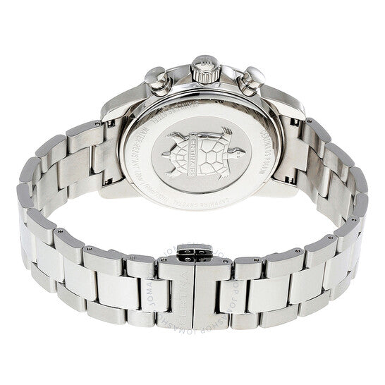 Stainless steel case with a stainless steel bracelet. Fixed stainless steel bezel showing tachymeter markings. Blue dial with luminous silver-tone hands and index hour markers. Arabic numerals mark the 3, 9 and 12 o'clock positions. Minute markers around the outer rim. Dial Type: Analog. Luminescent hands and markers. Date display at the 4 o'clock position. Chronograph - three sub-dials displaying: 60 second, 30 minute and 1/10th of a second. Quartz movement. Scratch resistant sapphire crystal. Solid case back. Case size: 42 mm. Case thickness: 12 mm. Round case shape. Band width: 22 mm. Deployment clasp with a push button release. Water resistant at 100 meters / 330 feet. Functions: chronograph, tachymeter, date, hour, minute, second. Dress watch style. Watch label: Swiss Made. Certina DS Podium Chronograph Blue Dial Men's Watch C034.417.11.047.00.