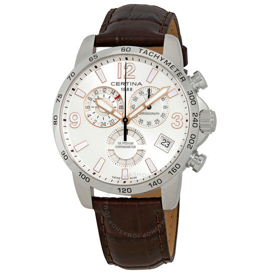 Silver-tone stainless steel case with a brown leather strap. Fixed silver-tone stainless steel bezel. Silver dial with rose gold-tone hands and index-Arabic numerals hour markers. Tachymeter scale around the outer rim. Dial Type: Analog. Luminescent hands and markers. Date display at the 4 o'clock position. Chronograph - three sub-dials displaying: 60 seconds, 12 hours, and 24 hours. ETA Caliber G10.962 BF quartz movement. Scratch resistant sapphire crystal. Solid case back. Round case shape. Case size: 42 mm. Butterfly clasp. Water resistant at 100 meters / 330 feet. Functions: GMT, second time zone, hour, minute, second, date, chronograph. Sport watch style. Watch label: Swiss Made. Certina DS Podium Chronograph Silver Dial Men's GMT Watch C034.654.16.037.01.