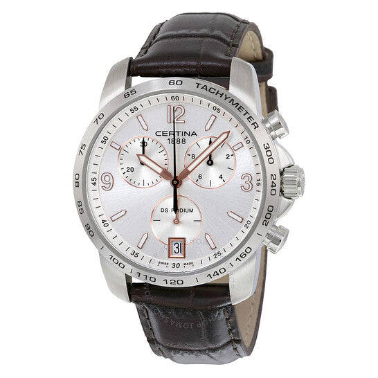 Stainless steel case with a genuine brown leather strap. Fixed stainless steel bezel showing tachymeter markings. Silver dial with luminous rose gold-tone hands and index hour markers. Arabic numerals mark the 3, 9 and 12 o'clock positions. Minute markers around the outer rim. Dial Type: Analog. Luminescent hands and markers. Date display at the 6 o'clock position. Chronograph - three sub-dials displaying: 60 second, 30 minute and 1/10th of a second. Quartz movement. Scratch resistant sapphire crystal. Solid case back. Case diameter: 40 mm. Case thickness: 11 mm. Round case shape. Band width: 22 mm. Deployment clasp. Water resistant at 100 meters / 330 feet. Functions: chronograph, tachymeter, date, hour, minute, second. Casual watch style. Watch label: Swiss Made. Certina DS Podium Chronograph Silver Dial Brown Leather Men's Quartz Watch C0014171603701.