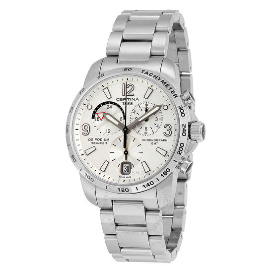 Stainless steel case with a stainless steel bracelet. Fixed stainless steel bezel showing tachymeter markings. Silver dial with luminous hands and index hour markers. An Arabic numerals mark the 3, 9 and 12 o'clock positions. Minute markers around the outer rim. Dial Type: Analog. Luminescent hands and markers. Date display at the 6 o'clock position. Chronograph - three sub-dials displaying: 60 second, dual 60 minute / 12 hour and 24 hour (GMT). Quartz movement. Scratch resistant sapphire crystal. Solid case back. Case diameter: 42 mm. Case thickness: 12 mm. Round case shape. Band width: 20 mm. Fold over clasp. Water resistant at 100 meters / 330 feet. Functions: chronograph, tachymeter, GMT, date, hour, minute, second. Casual watch style. Watch label: Swiss Made. Certina DS Podium GMT Silver Dial Stainless Steel Men's Watch C0016391103700.