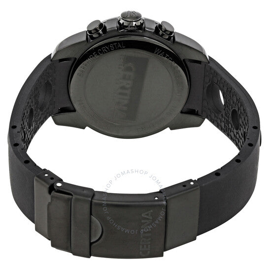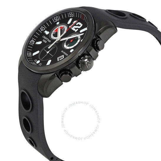 Black PVD stainless steel case with a black rubber strap. Fixed black PVD stainless steel bezel. Black dial with luminous silver-tone hands and index hour markers. Arabic numeral appears at the 12 o'clock position. Arabic numeral minute markers (at 5 minute intervals). Minute markers around the outer rim. Dial Type: Analog. Luminescent hands and markers. Date display at the 4 o'clock position. Chronograph - three sub-dials displaying: 60 second, 30 minute and 10 hour. ETA Caliber G10.211 quartz movement. Scratch resistant sapphire crystal. Solid case back. Round case shape, case size: 40 mm, case thickness: 11.7 mm. Band width: 20 mm. Fold over clasp with a safety release. Water resistant at 100 meters / 330 feet. Functions: chronograph, rattrapante, date, hour, minute, small second. Ds Rookie Series. Casual watch style. Watch label: Swiss Made. Certina DS Rookie Chronograph Quartz Black Dial Men's Watch C016.417.17.057.01.