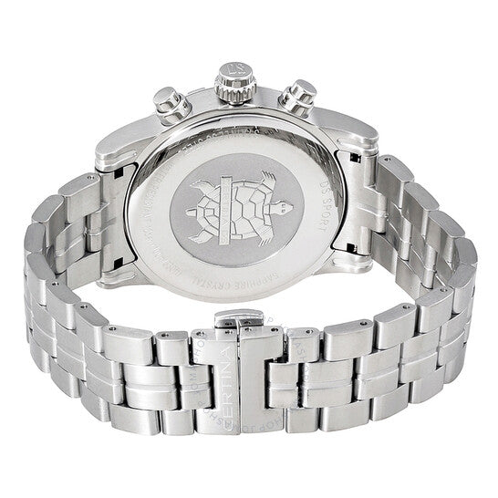 Stainless steel case with a stainless steel bracelet. Fixed stainless steel bezel with a black top ring. Black dial with luminous silver-tone hands and index hour markers. An Arabic numeral appears at the 12 o'clock position. Minute markers around the outer rim. Dial Type: Analog. Luminescent hands and markers. Date display at the 4 o'clock position. Chronograph - three sub-dials displaying: 60 second, 30 minute and 1/10th of a second. ETA caliber G10.212 AB quartz movement. Scratch resistant sapphire crystal. Solid case back. Case size: 42 mm. Case thickness: 11.2 mm. Round case shape. Deployment clasp with a push button release. Water resistant at 100 meters / 330 feet. Functions: chronograph, rattrapante, date, hour, minute, small second. Sport watch style. Watch label: Swiss Made. Certina DS Sport Chronograph Black Dial Men's Watch C027.417.11.057.01.