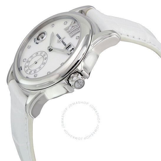 Stainless steel case with a white leather strap. Fixed stainless steel bezel. Mother of pearl dial with silver-tone hands and diamond hour markers. Diamond-set Arabic numeral marks the 12 o'clock position. Dial Type: Analog. Dual time display at the 9 o'clock position. Date display at the 2 o'clock position. Seconds sub-dial at the 6 o'clock position. Automatic movement with a 48-hour power reserve. Scratch resistant sapphire crystal. Transparent case back. Case size: 37 mm. Round case shape. Fold over clasp. Water resistant at 100 meters / 330 feet. Functions: date, hour, minute, second, dual time. Luxury watch style. Ulysse Nardin Dual Time Ladies Watch 3343-222/391.