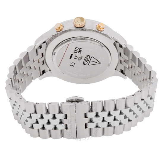 Silver-tone stainless steel case and bracelet. Fixed silver-tone stainless steel bezel. Blue dial with index hour markers. Double-gancio symbol at the 8 o'clock position. Minute markers around the outer rim. Dial Type: Analog. Luminescent hands and markers. Date display at the 4 o'clock position. Chronograph - three sub-dials displaying: 60 second, 30 minute and 1/10th of a second. Quartz movement. Scratch resistant sapphire crystal. Pull / push crown. Solid case back. Round case shape, case size: 43 mm. Butterfly clasp. Water resistant at 50 meters / 165 feet. Functions: chronograph, date, hour, minute, second. Duo Series. Sport watch style. Watch label: Swiss Made. Ferragamo Duo Chronograph Quartz Blue Dial Men's Watch SFEZ01324.