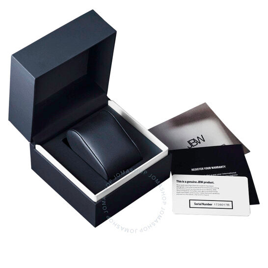 Stainless steel case with a blue (croco-embossed) leather strap. Fixed stainless steel bezel set with crystals. Silver dial with luminous silver-tone hands and index hour markers. Minute markers. Dial Type: Analog. Luminescent hands and markers. Date display between the 4 and 5 o'clock positions. Chronograph - three sub-dials displaying: 60 second, 30 minute and 24 hour. Quartz movement. Scratch resistant mineral crystal. Pull / push crown. Solid case back. Tonneau case shape. Case size: 41 mm. Case thickness: 12 mm. Band width: 22 mm. Band length: 8.5 inches. Deployment with push button release clasp. Water resistant at 50 meters / 165 feet. Functions: date, hour, minute, second. Additional Info: 28 diamonds. Echelon Series. Luxury watch style. Watch label: Japan Movt. JBW Echelon Quartz Silver Dial Blue Leather Men's Watch J6379C.