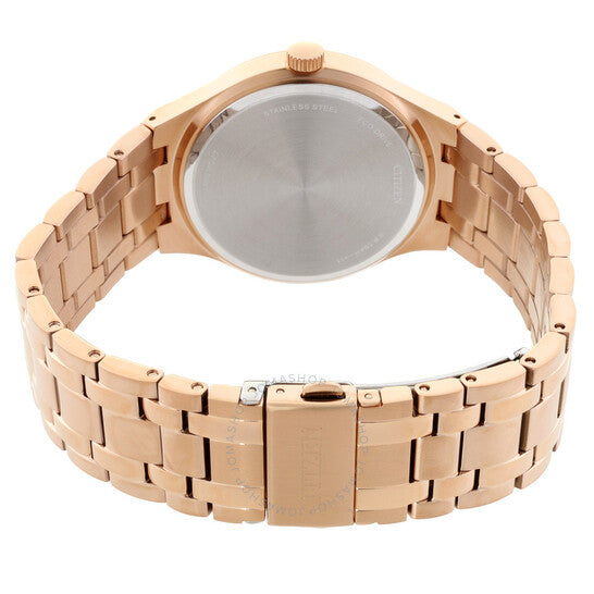 Rose gold-tone stainless steel case and bracelet. Fixed rose gold-tone stainless steel bezel. Black dial with rose gold-tone hands and index hour markers. Dial Type: Analog. Citizen Caliber Eco-Drive E111 eco-drive movement. Scratch resistant mineral crystal crystal. Pull / push crown. Solid case back. Round case shape, case size: 40 mm, case thickness: 9.25 mm. Water resistant at 50 meters / 165 feet. Functions: date, hour, minute, second, solar-powered. Eco-drive Series. Dress watch style. Watch label: Japan Movt. Citizen Eco-Drive Black Dial Men's Watch BM7653-50E.