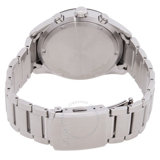 Silver-tone stainless steel case and bracelet. Fixed tachymeter scale black stainless steel bezel. Black dial with silver-tone hands and index hour markers. Minute markers around the outer rim. Dial Type: Analog. Date display between 4 and 5 o'clock position. Chronograph - three sub-dials displaying: 60 second, 60 minute and 24 hour. Citizen Caliber Eco-Drive B620 eco-drive movement. Scratch resistant sapphire crystal. Solid case back. Round case shape, case size: 43 mm, case thickness: 11.3 mm. Deployment with push button release clasp. Water resistant at 100 meters / 330 feet. Functions: chronograph, date, hour, minute, second, solar-powered. Eco-drive Series. Sport watch style. Watch label: Japan Movt. Citizen Eco-Drive Chronograph Black Dial Men's Watch CA4674-58E.