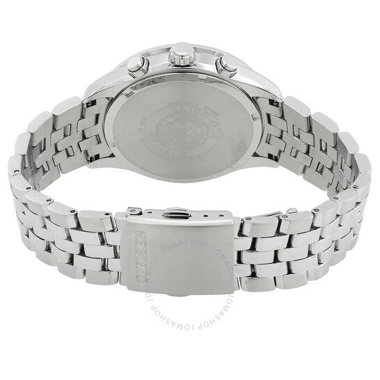 Silver-tone stainless steel case and bracelet. Fixed silver-tone stainless steel bezel. Blue dial with silver-tone hands and index hour markers. Tachymeter scale around the inner rim. Dial Type: Analog. Luminescent hands and markers. Date display at the 4 o'clock position. Chronograph - sub-dials displaying: 24 hours, 60 minutes, 60 seconds. Citizen Caliber Eco-Drive H504 eco-drive movement. Scratch resistant sapphire crystal. Solid case back. Round case shape, case size: 42 mm. Folding clasp. Water resistant at 100 meters / 330 feet. Functions: chronograph, date, GMT, hour, minute, second, solar-powered. Eco-drive Series. Sport watch style. Watch label: Japan Movt. Citizen Eco-Drive Chronograph Blue Dial Men's Watch AT2140-55L.