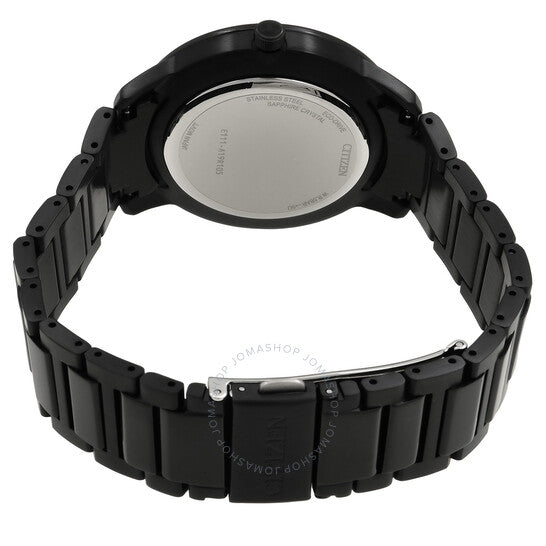 Black stainless steel case and bracelet. Fixed black stainless steel bezel. Purple dial with rose gold-tone hands and index hour markers. Minute markers around the outer rim. Dial Type: Analog. Date display at the 3 o'clock position. Citizen Caliber Eco-Drive E111 eco-drive movement. Scratch resistant sapphire crystal. Pull / push crown. Solid case back. Round case shape, case size: 39.2 mm, case thickness: 9.5 mm. Deployment with push button release clasp. Water resistant at 50 meters / 165 feet. Functions: date, hour, minute, second, solar-powered. Eco-drive Series. Casual watch style. Watch label: Japan Movt. Citizen Eco-Drive Purple Dial Men's Watch BM7595-89X.