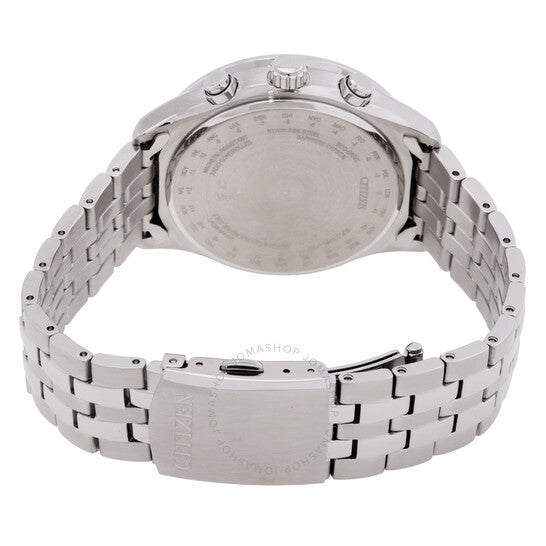 Silver-tone stainless steel case and bracelet. Fixed silver-tone stainless steel bezel. Blue dial with silver-tone hands and index hour markers. Minute markers around the outer rim. Dial Type: Analog. Date display at the 4 o'clock position. Three sub-dials displaying: moon phase, 24 hour and day. Citizen Caliber H874 eco-drive movement. Scratch resistant sapphire crystal. Solid case back. Round case shape, case size: 42 mm, case thickness: 10.7 mm. Deployment with push button release clasp. Water resistant at 100 meters / 330 feet. Functions: date, day, hour, minute, second, moon phase, perpetual calendar, global radio-controlled, 24 time zone world time, power reserve level indication. Eco-drive Series. Sport watch style. Watch label: Japan Movt. Citizen Eco-Drive Radio-Controlled Moon Phase Blue Dial Men's Watch BY1030-50L.