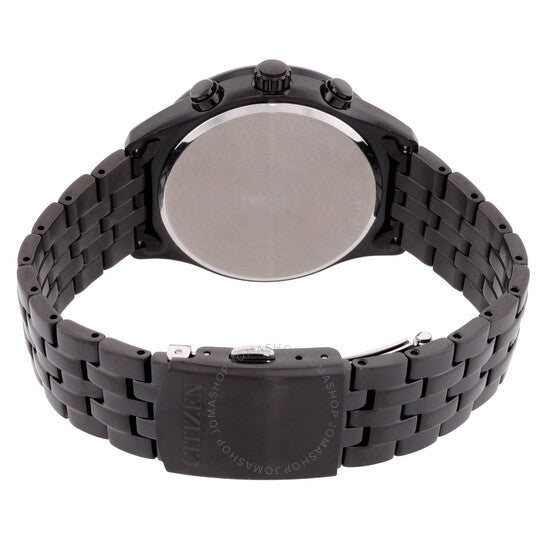 Black IP stainless steel case and bracelet. Fixed black IP stainless steel bezel. Blue dial with rose gold-tone hands and index hour markers. Minute markers around the outer rim. Dial Type: Analog. Date display at the 4 o'clock position. Three sub-dials displaying: moon phase, 24 hour and day. Citizen Caliber H874 eco-drive movement. Scratch resistant sapphire crystal. Solid case back. Round case shape, case size: 42 mm, case thickness: 10.7 mm. Deployment with push button release clasp. Water resistant at 100 meters / 330 feet. Functions: date, day, hour, minute, second, moon phase, perpetual calendar, global radio-controlled, 24 time zone world time, power reserve level indication. Eco-drive Series. Sport watch style. Watch label: Japan Movt. Citizen Eco-Drive Radio-Controlled Moon Phase Blue Dial Men's Watch BY1035-56L.