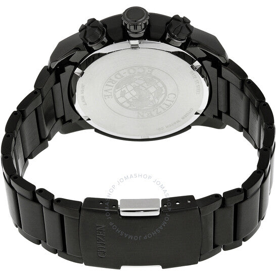 Black PVD stainless steel case with a black PVD stainless steel bracelet. Fixed black PVD bezel. Black dial with black hands and index hour markers. Minute markers. Tachymeter markings around the outer rim. Dial Type: Analog. Date display between the 4 and 5 o'clock positions. Chronograph - three sub-dials displaying: 60 second, 60 minute and 24 hour. Citizen caliber Eco-Drive B620 eco-drive movement. Scratch resistant mineral crystal. Pull / push crown. Solid case back. Round case shape. Case size: 48 mm. Case thickness: 13 mm. Band width: 20 mm. Band length: 8 inches. Fold over with hidden double push button clasp. Water resistant at 100 meters / 330 feet. Functions: chronograph, date, hour, minute, second, tachymeter. Casual watch style. Watch label: Japan Movt. Citizen Ecosphere Eco-Drive Black Dial Men's Watch CA4184-81E.