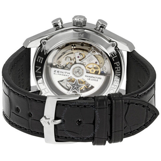 Stainless steel case with a black croco-embossed leather strap. Fixed stainless steel bezel. Silver sunray dial with silver-tone hands and index hour markers. Minute markers. Tachymeter scale around the outer rim. Luminescent hands and markers. Date display at the 6 o'clock position. Chronograph - three sub-dials displaying: 60 seconds, 30 minutes and 12 hours. Automatic mechanical movement. Scratch resistant sapphire crystal. Skeleton case back. Case diameter: 42 mm. Case thickness: 14 mm. Tang clasp. Water resistant at 100 meters / 330 feet. Functions: hours, minutes, small seconds, calendar, chronograph. Zenith El Primero Silver Chronograph Dial Men's Watch 03204040001C496.