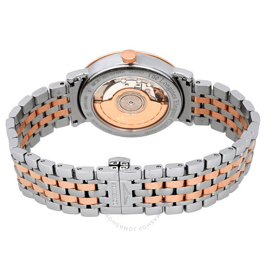 Stainless steel case with a two-tone (silver-tone and rose gold cap 200) stainless steel bracelet. Fixed rose gold cap 200 bezel. Black dial with rose gold-tone hands and diamond hour markers. Dial Type: Analog. Date display at the 3 o'clock position. Longines calibre L619/888 automatic movement, based upon ETA 2892, containing 21 Jewels, bitting at 25200 vph, and has a power reserve of approximately 64 hours. Scratch resistant sapphire crystal. Push / pull crown. Transparent case back. Round case shape. Case size: 37 mm. Band width: 19 mm. Fold over clasp with a push button release. Water resistant at 30 meters / 100 feet. Functions: date, hour, minute, second. Additional Info: dial st with 13 diamonds (0.032 carats). Elegant Series. Luxury watch style. Watch label: Swiss Made. Longines Elegant Automatic Black Dial Two-tone Men's Watch L48105577.