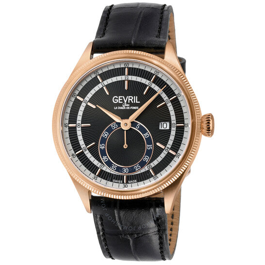 Rose gold-tone stainless steel case with a black leather strap. Fixed rose gold-tone stainless steel bezel. Black dial with rose gold-tone hands and index hour markers. Minute markers around the outer rim. Dial Type: Analog. Date display at the 3 o'clock position. One subdial displaying: small second. ETA Caliber 2895-2 Automatic movement, based upon ETA 2892-A2, containing 27 Jewels, bitting at 28800 vph, and has a power reserve of approximately 42 hours. Scratch resistant sapphire crystal. Screw down crown. Transparent case back. Round case shape, case size: 40 mm, case thickness: 10 mm. Band width: 20 mm. Buckle clasp. Water resistant at 100 meters / 330 feet. Functions: date, hour, minute, small second. Additional Info: seconds subdial. Empire Series. Luxury watch style. Watch label: Swiss Made. Gevril Empire Automatic Black Dial Men's Watch 48103.