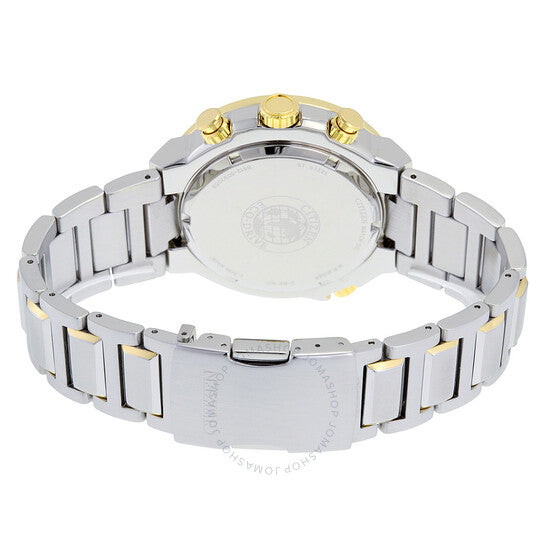 Stainless steel case with a stainless steel bracelet with gold-tone accents. Fixed gold-tone bezel. Dark blue dial with luminous gold-tone hands and index hour markers. Minute markers around the outer rim. Dial Type: Analog. Luminescent hands and markers. Date display at the 3 o'clock position. Chronograph - three sub-dials displaying: 60 second, 60 minute and 24-hours. Eco-drive movement. Scratch resistant mineral crystal. Solid case back. Case diameter: 46 mm. Case thickness: 13 mm. Round case shape. Band length: 10 inches. Hidden double push button clasp. Water resistant at 200 meters / 660 feet. Functions: chronograph, date, hour, minute, second. Additional Info: rotating inner ring. Casual watch style. Watch label: Japan Movt. Item Variations: CA0444 50L, CA0444.50L, CA044450L. Citizen Endeavor Eco-Drive Dark Blue Dial Men's Watch CA0444-50L.
