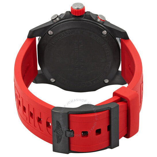 Black composite (ultralight polymer) case with a red rubber strap. Bi-directional rotating black composite (ultralight polymer) bezel showing (360 degree) compass markings bezel. Black dial with luminous silver-tone hands and Arabic numeral hour markers. Minute markers. Pulsometer markings around the outer rim. Dial Type: Analog. Luminescent hands and markers. Date display between the 4 and 5 o'clock positions. Chronograph - three sub-dials displaying: 60 second, 30 minute and 1/10th of a second. Breitling Calibre 82 quartz movement. Scratch resistant sapphire crystal. Pull / push crown. Round case shape. Case size: 44 mm. Band width: 22 mm. Tang clasp. Water resistant at 100 meters / 330 feet. Functions: chronograph, date, hour, minute, second. Endurance Pro Series. Casual watch style. Watch label: Swiss Made. Breitling Endurance Pro Chronograph Quartz Black Dial Men's Watch X82310D91B1S1.