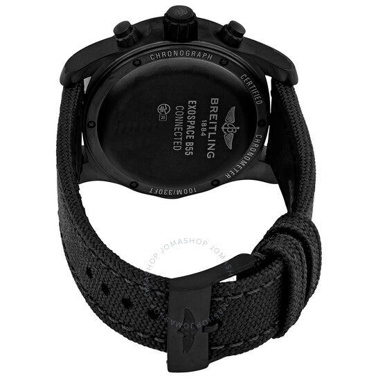 Breitling black titanium case with a black fabric strap. Bi-birectional rotating breitling black titanium bezel. Volcano black dial with luminous grey hands and Arabic numeral hour markers. Minute markers. 1/100th second markers around the outer rim. Dial Type: Analog-digital. Luminescent hands and markers. Perpetual calendar. Two digital sub-dials. Breitling calibre 55 quartz movement. Scratch resistant sapphire crystal. Pull / push crown. Solid case back. Round case shape. Case size: 46 mm. Case thickness: 15.25 mm. Band width: 24 mm. Tang clasp. Water resistant at 100 meters / 330 feet. Functions: perpetual calendar, chronograph, year, month, date, day, GMT, second time zone, hour, minute, second, power reserve indicator, chronometer, Bluetooth. Exospace B55 Series. Sport watch style. Watch label: Swiss Made. Breitling Exospace B55 Perpetual Chronograph Quartz Analog-Digital Chronometer Watch VB5510H11B1W1.