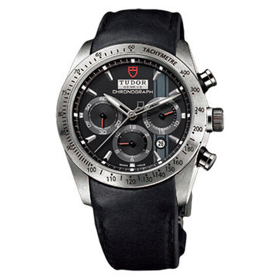 Silver-tone stainless steel case with a black leather strap. Fixed tachymeter scale silver-tone stainless steel bezel. Black dial with luminous hands and index hour markers. Minute markers around the outer rim. Dial Type: Analog. Luminescent hands and markers. Date display between 4 and 5 o'clock position. Chronograph - three sub-dials displaying: 60 second, 30 minute and 12 hour. ETA-Valjoux Caliber 7753 Automatic movement, based upon ETA 7750, containing 27 Jewels, bitting at 28800 vph, and has a power reserve of approximately 44 hours. Scratch resistant sapphire crystal. Screw down crown. Round case shape. Case size: 42 mm. Deployment clasp. Water resistant at 150 meters / 500 feet. Functions: chronograph, date, hour, minute, second. Luxury watch style. Watch label: Swiss Made. Item Variations: 42000-blackleather-blackindex. Tudor Fastrider Black Dial Chronograph Black Leather Men's Watch 42000-BKSBKLS.