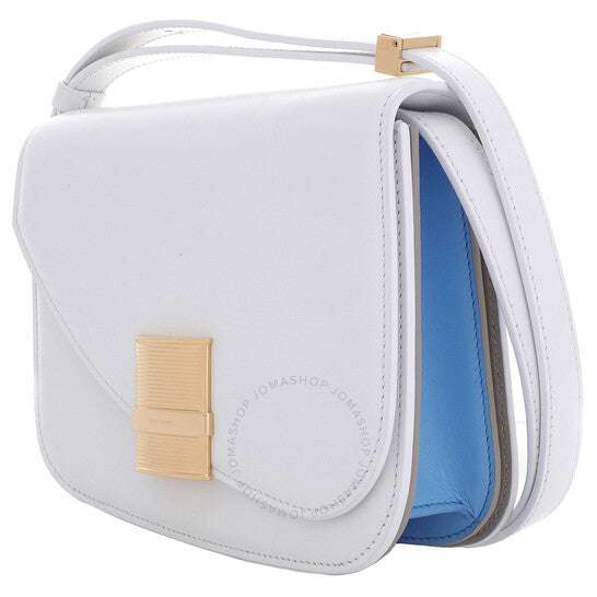 Ferragamo Ladies Shoulder Bag. SKU: 215971 773225. Barcode: 8056283695657. Color: White. Size: H: 6.1" x L: 7.4" x W: 2.9". Ferragamo Fiamma S Shoulder Bag. The Ferragamo shoulder bag features a classic silhouette enhanced by an asymmetric flap with an iconic clasp, crafted from dappled calfskin with visible edge stitching, a spacious lined interior with card slots, and an adjustable shoulder strap. 100% Calfskin. Made in Italy.