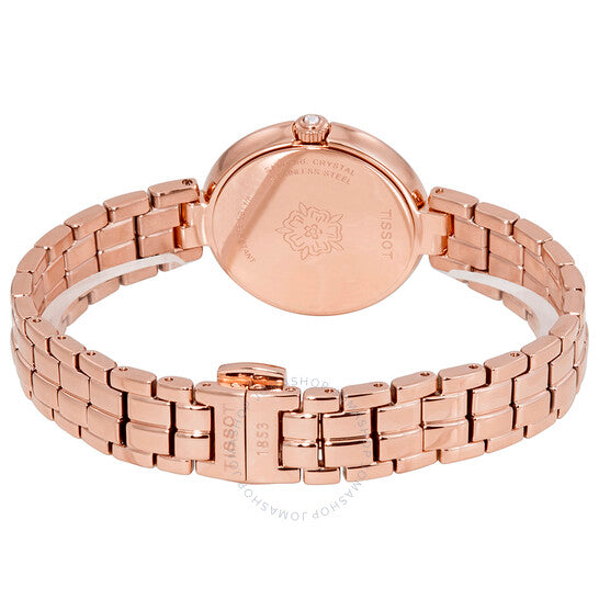 Rose gold PVD stainless steel case amd bracelet. Fixed rose gold PVD bezel. White mother of pearl dial with rose gold-tone hands and index hour markers. Dial Type: Analog. Date display above the 6 o'clock position. ETA Caliber F03.111 quartz movement. Scratch resistant sapphire crystal. Pull / push crown. Solid case back. Round case shape. Case size: 26 mm. Case thickness: 6.4 mm. Band width: 7 mm. Butterfly clasp. Water resistant at 50 meters / 165 feet. Functions: date, hour, minute, second, battery eol indicator. Dress watch style. Watch label: Swiss Made. Tissot Flamingo White Mother of Pearl Dial Ladies Watch T094.210.33.111.01.
